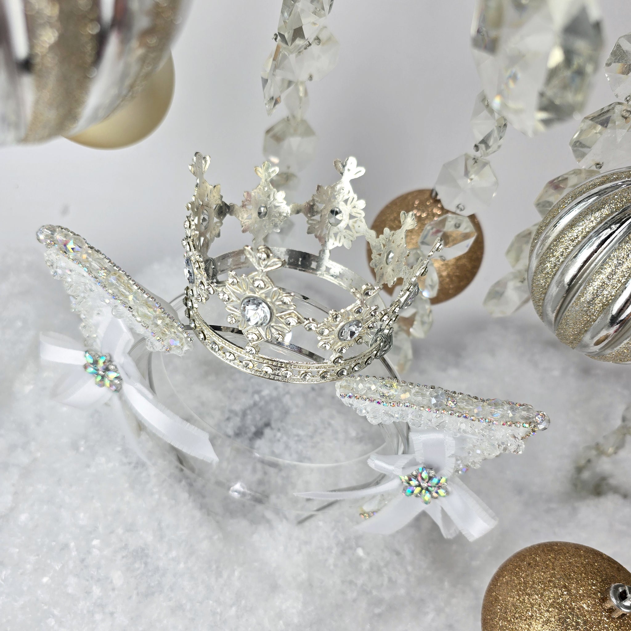 • A magnet is placed inside each corner of the ear to hold the white handmade silk bows, featuring a beautiful AB crystal snowflake center pendant. These bows are removable so you can customize your look when you want!