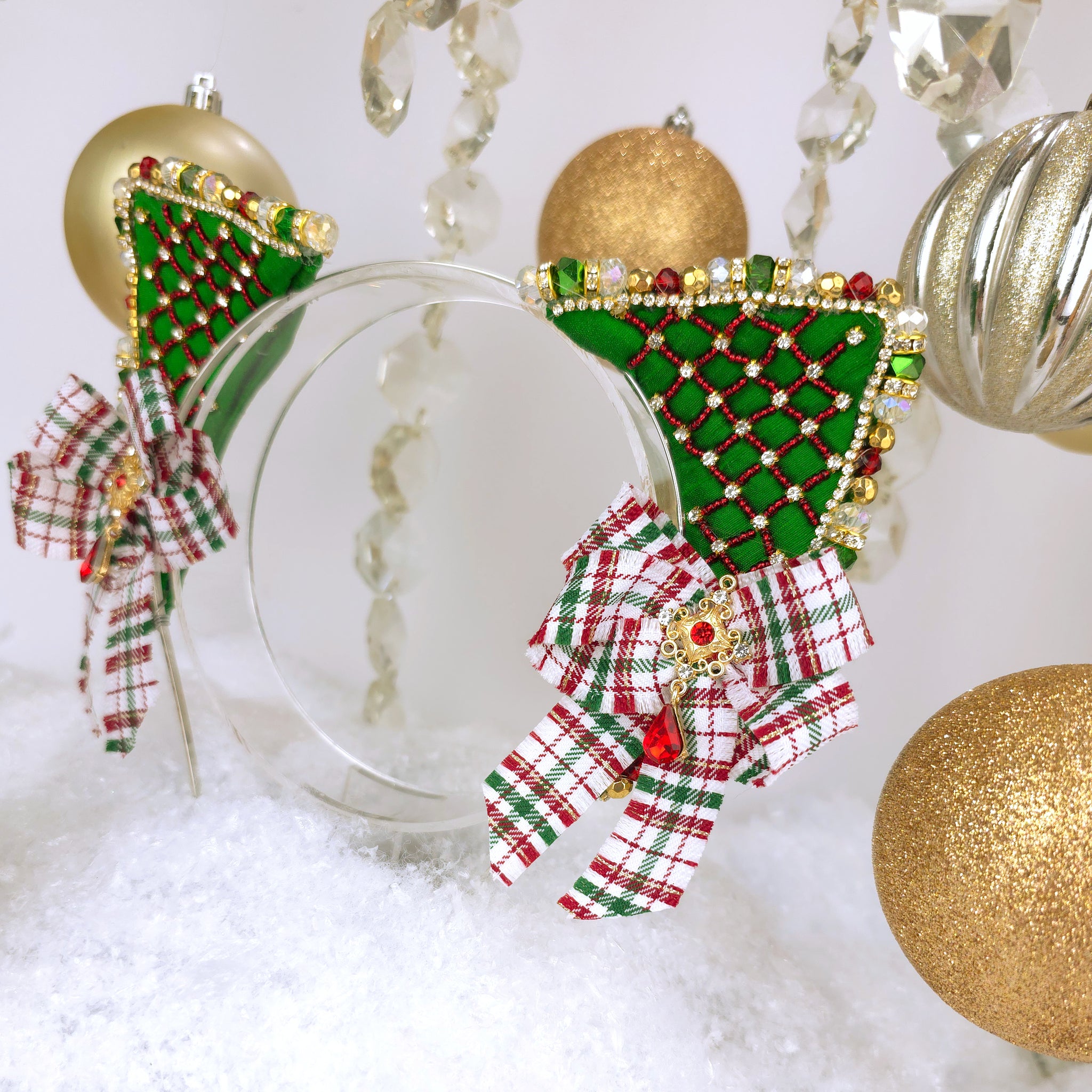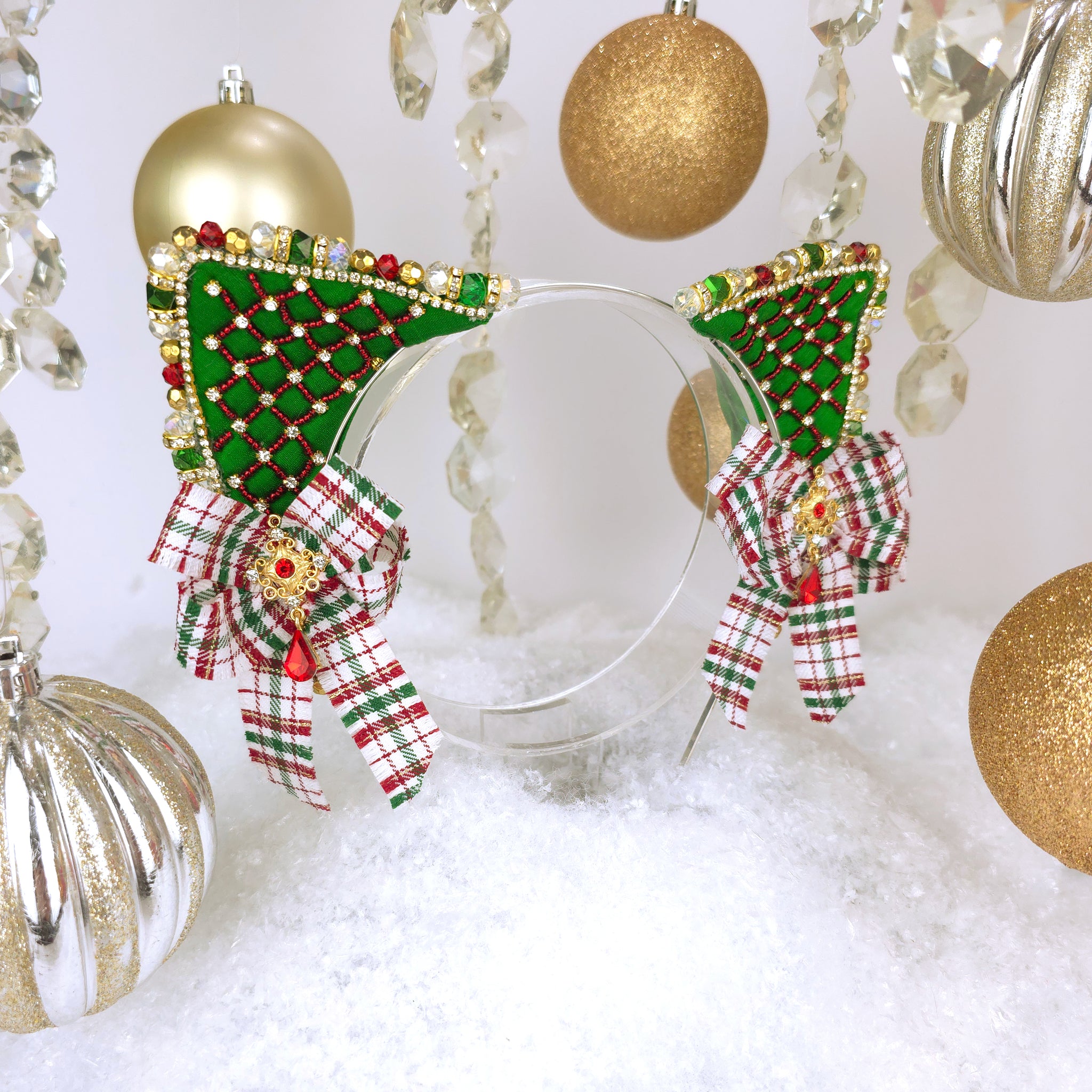 - The edges of the ears feature hand-selected matching beads in green, gold, red, and rhinestone, with a thin trim of golden sparkling rhinestone underneath on the front and back, all secured tightly with invisible thread hand stitching.