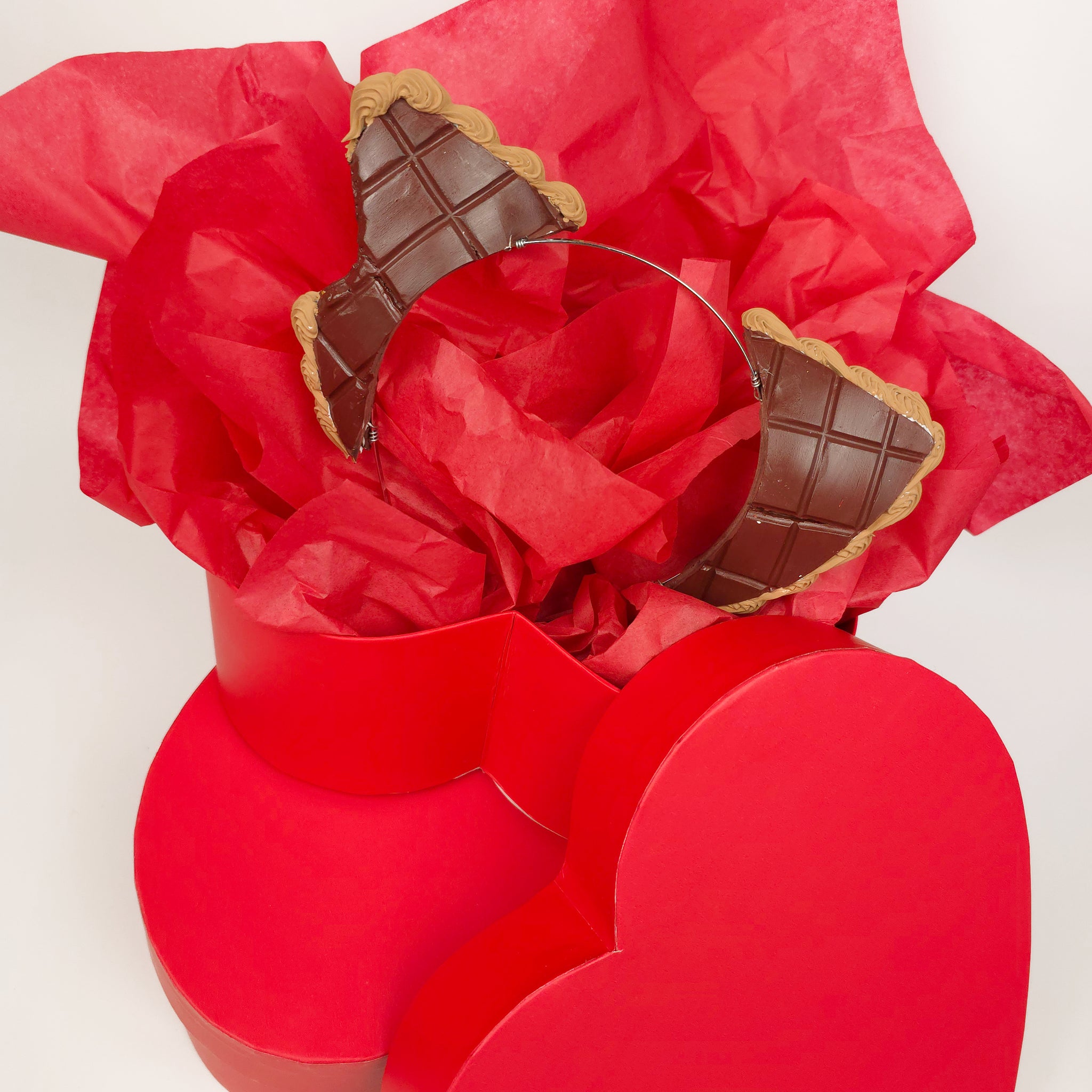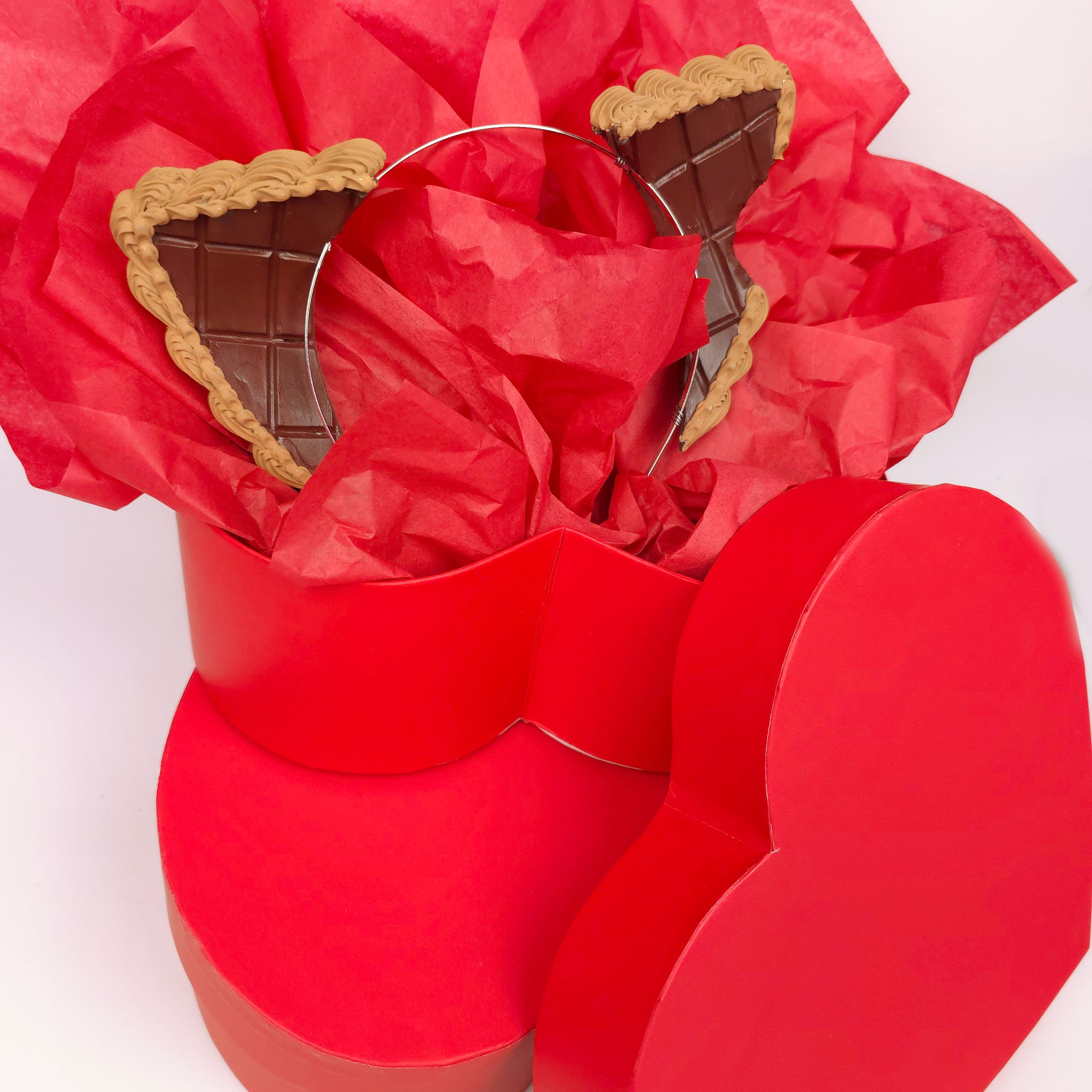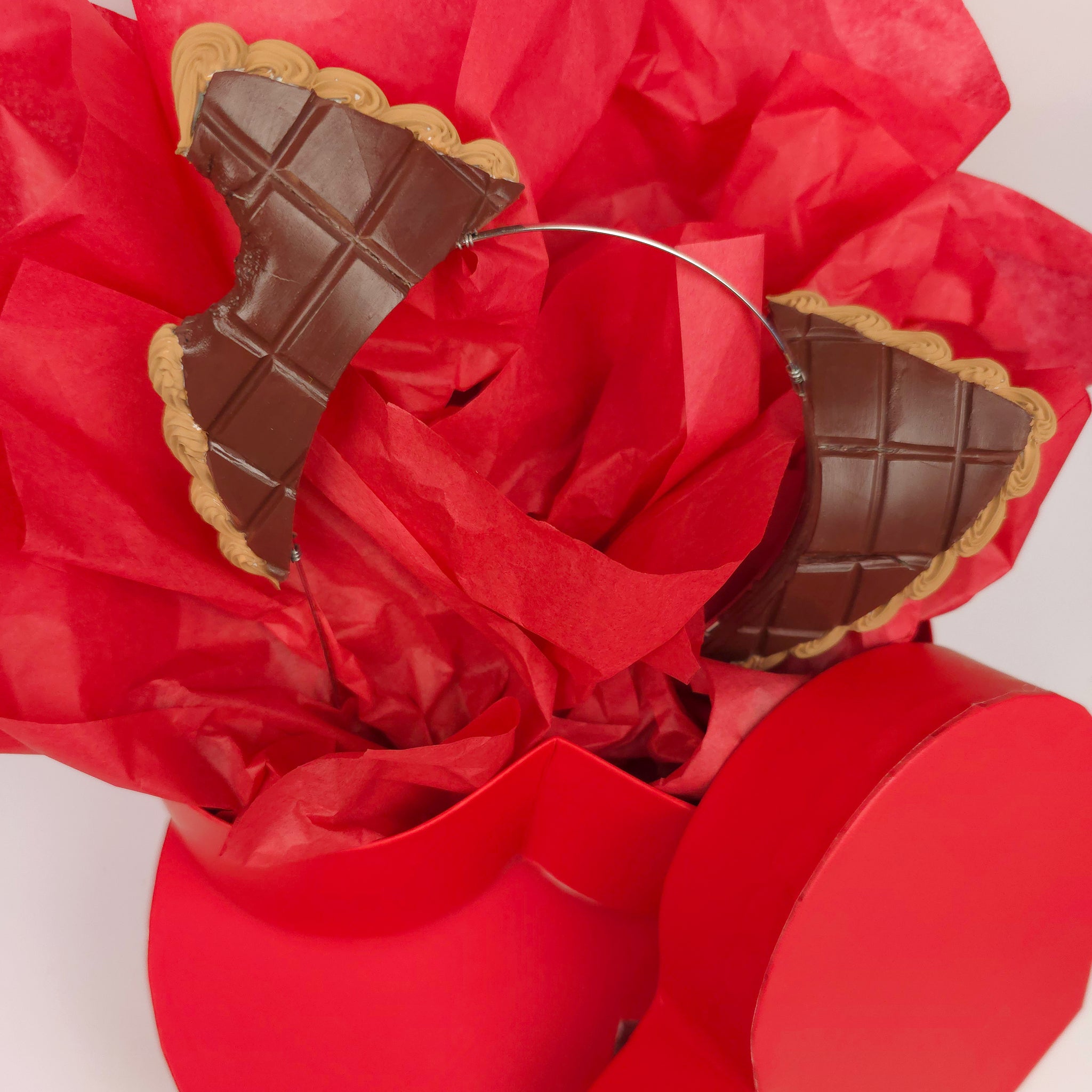 These faux chocolate-bar cat ears look just like real candy squares, complete with glossy “chocolate” texture and piped mocha frosting trim. Sweet, fun, and totally handmade, but not edible!